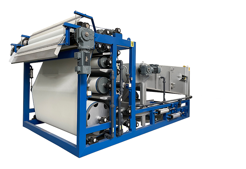 A belt filter press squeezes wet solids or sludge between moving belts to remove liquid. These are primarily used to thicken the sludge before disposal. Its performance is affected by variables like the feed solids characteristics, polymer dosage and belt type, tension and speed.